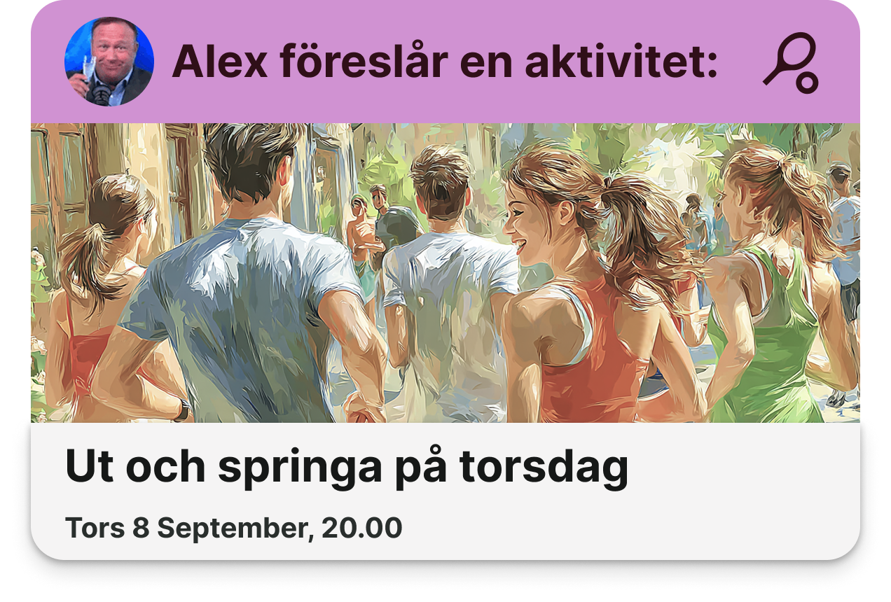 Vill du ha sällskap på löpturen, ordna gårdsloppis eller bara bjuda in till fredagsfika? Skapa en aktivitet och låt grannarna anmäla sig direkt i appen.