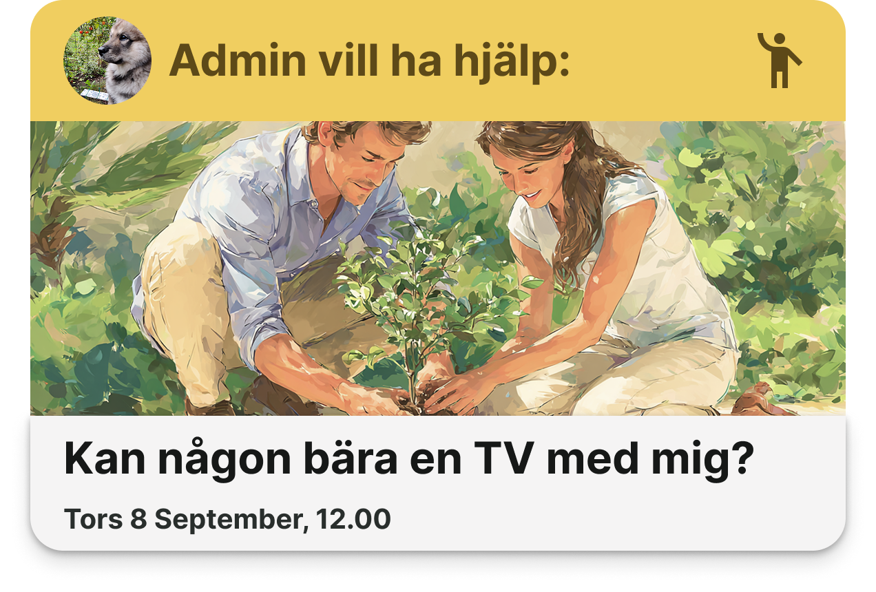När du behöver en hjälpande hand, är dina grannar bara ett klick bort. Be någon låna ut verktyg, vattna blommor när du reser, eller ge en hand med ett lyft. Med Grannsam blir det naturligt att både fråga och få hjälp.