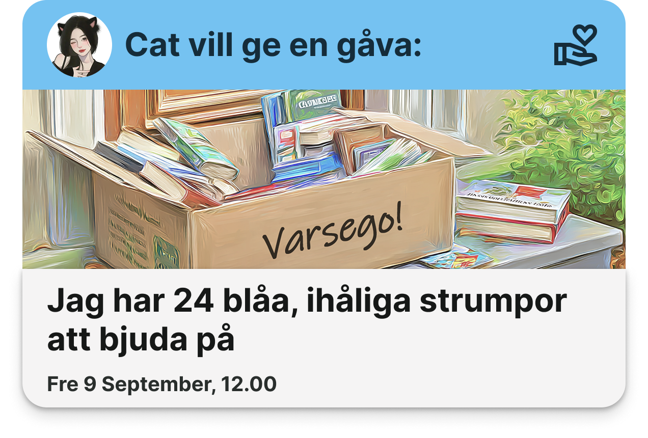 Saker som inte längre behövs hos dig kan glädja någon annan. Med gåvofunktionen delar du enkelt med dig till kvarteret och minskar samtidigt svinnet. Ett litet klick kan sprida mycket värme.